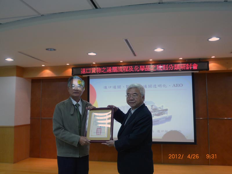 台北市進出口公會由化工小組許召集人庭禎、本會由陳理事長光宇分別代表各自公會向基隆關稅局致贈感謝狀。