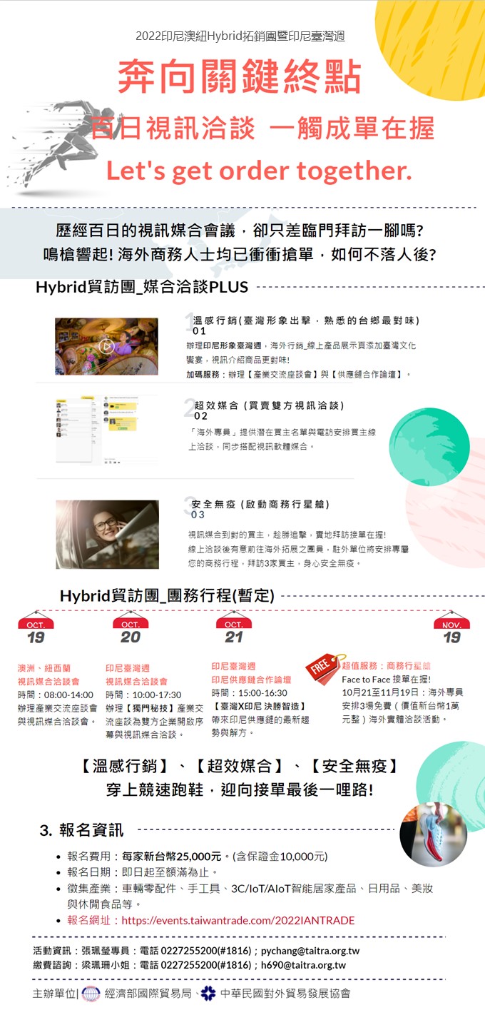2022-08-19 檢轉 財團法人中華民國對外貿易發展協會-「2022年印尼澳紐Hybrid拓銷團暨印尼臺灣週」參加規範及廣宣資料如附件,請會員報名參加。 北市化工111-080--檔案下載 參加作業規範--檔案下載 活動執行說明--檔案下載 回上一頁